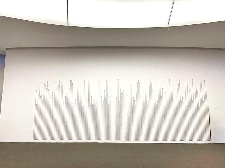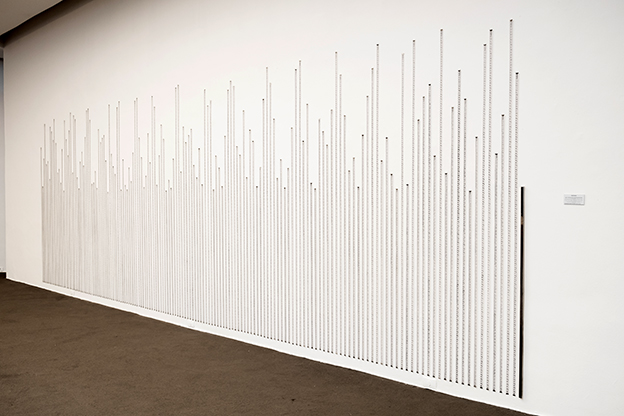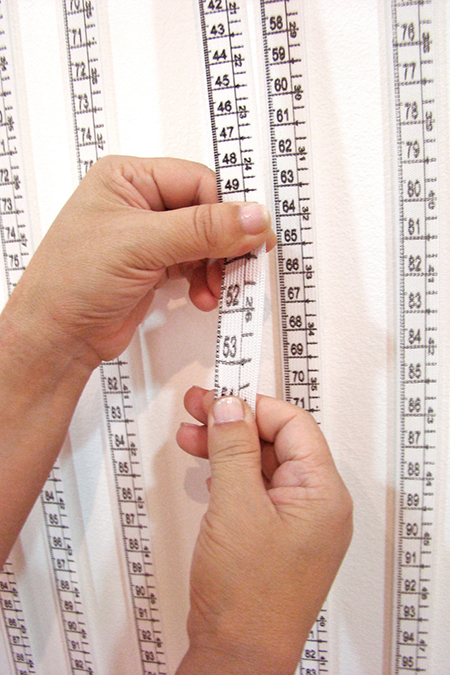 Instalação "Sob Medida", 2009 | Impressão serigráfica sobre elásticos têxteis , gravação a laser em tubo de inox | Dimensões variáveis